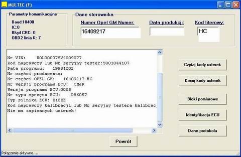 Przykład działania interfejsu w połączeniu z samochodem Opel ASTRA-G 1.8 2000r na systemie WINDOWS XP przy współpracy z programem Opel TECH2 (program dostępny jest w całości w języku polskim).