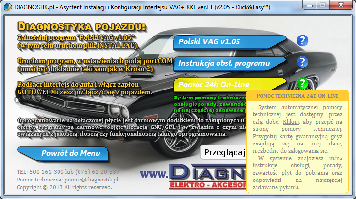 Oferowany produkt w żaden sposób nie narusza praw autorskich ani własności intelektualnej. Program instalacyjny, instrukcje obsługi oraz wszelkiego typu poradniki należą do firmy DIAGNOSTIK. Pozostałe materiały objęte są licencją GNU General Public License.
