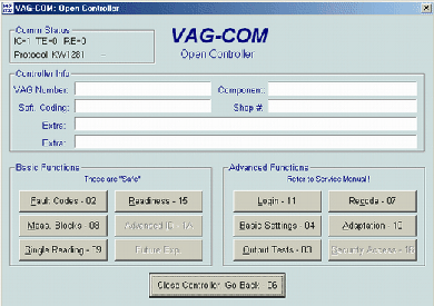 Po uruchomieniu programu wybieramy moduł (Rys. 2) z którym chcemy się połączyć (może to być sterownik silnika, abs`u, air-bag`u, immobilisera lub każdy inny spośród kilkudziesięciu dostępnych). ![]() Rys. 2 - Program Vag-com - wybór sterownika. (kliknij aby powiększyć rysunek) Gdy dokonamy wyboru odpowiedniego modułu czekamy na zgłoszenie się sterownika (Rys. 3). ![]() Rys. 3 - Program Vag-com - połączenie ze sterownikiem. (kliknij aby powiększyć rysunek) Po połączeniu ze sterownikiem można wybrać interesujące nas funkcje podstawowe (np. odczyt kodów usterek, bloki pomiarowe, pojedynczy odczyt), lub funkcje zaawansowane (np. kodowanie, nastawy podstawowe, przeprowadzanie adaptacji elementów wykonawczych, test elementów wykonawczych). Na poniższym rysunku (Rys. 4) przedstawiono działanie funkcji "Bloki pomiarowe". Diagnozowane auto to Skoda Octavia 1.6 `99r. Rysunek przedstawia pracę silnika na biegu jałowym oraz reakcję na naciśnięcie pedału gazu. ![]() Rys. 4 - Program Vag-com - funkcja "Bloki pomiarowe". (kliknij aby powiększyć rysunek) W ten prosty sposób można sprawdzić każdy samochód koncernu VAG. Wystarczy wsiąść do auta, włączyć program i zrobić próbną jazdę obserwując aktualne parametry pracy. ... jako jedyni na rynku oferujemy bezpłatną, fachową pomoc techniczną. Masz problem z instalacją sterownika, obsługą programu, lokalizacją złącza diagnostycznego? - wystarczy, że napiszesz do nas na adres mailowy pomoc@diagnostik.pl - nasz konsultant odpowie na każde zadane pytanie. Tego produktu nie trzeba reklamować. Nadal się wahasz? Koszt podłączenia auta pod komputer u specjalisty to około 100zł (lub nawet 200zł, w autoryzowanym serwisie). Wystarczy, że zdiagnozujesz auto sobie i sąsiadowi, a interfejs już się zwróci. ...i nie zapominaj - jest Twój na zawsze! UWAGA - SAMODZIELNE PRZEPROWADZENIE DIAGNOSTYKI W SAMOCHODZIE DLA NIEDOŚWIADCZONEGO UŻYTKOWNIKA NIE PRZEKROCZY 5-10 MINUT PAMIĘTAJ !!! - jeżeli sam zdiagnozujesz usterkę w swoim samochodzie będziesz mógł ją szybko samemu usunąć (często bywa, że zamiast wymieniać rzekomo uszkodzoną część, wystarczy sprawdzić przewody, które z biegiem czasu mogą się przecierać powodując utratę sygnału lub zaśniedzieć na stykach - wówczas wystarczy je tylko przeczyścić) lub zlecić mechanikowi konkretną naprawę, oszczędzając przy tym sporo czasu i pieniędzy na ustalenie przyczyny usterki. GWARANCJA JAKOŚCI
